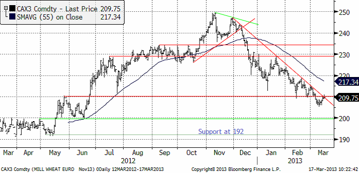 Liksom förra veckan tror jag att de tre senaste månadernas prisfall på vete är över. Däremot tror jag inte på någon rask uppgång, utan mer på ”sidledes” rörelse medan marknaden tolkar de rapporter som kommer in – och lagerstatistiken som USDA publicerar den 28 mars. Ska man hålla koll på någonting särskilt är det om 210-nivån på Matif bryts på uppsidan. Det vore ett klart styrketecken om köparna lyckas ta hand om alla säljordrar som troligtvis anhopat sig där.