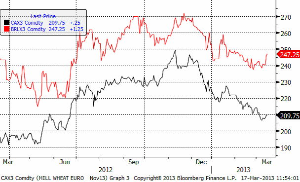 Det har kommit en del statistik i veckan – som pekar åt olika håll. Franska Cocerals rapport indikerar högre priser. De tror att skörden i Frankrike blir bara något högre och 12 mt lägre i Storbritannien, där sådden var 25% mindre än normalt i höstas. Frankrike, som är EU:s största veteproducent beräknas bara öka skörden marginellt med 0.1 mt till 35.9 mt. Detta beror på att de största odlingsdistrikten Picardie och Centre fick mer än dubbelt så mycket nederbörd som normalt i december. FranceAgriMer estimerar att 66% av den franska veteskörden är i ”good” eller ”very good” condition per den 4 mars. Förra året samma tid var siffran 68%. Det är alltså nästan samma nivå.