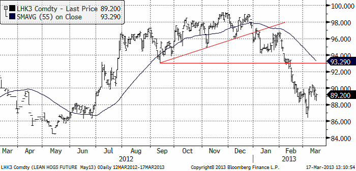 Grispriset (Maj 13) vände ner igen, precis som vi skrev förra veckan. Prisuppgången i början på mars får vi än så länge betrakta som en rekyl mot den i det större perspektivet fallande trenden.
