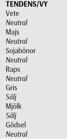 Olyckligtvis lämnade vi förra veckan en negativ vy på rapsen till nuvarande neutrala. Om marknaden handlar ner priset under 415 går vi omedelbart över till negativ vy igen, annars håller vi fast vid det neutrala. Jag tror inte man bör vara lång raps, så har man raps som inte är prissäkrat bör man överväga att göra det.