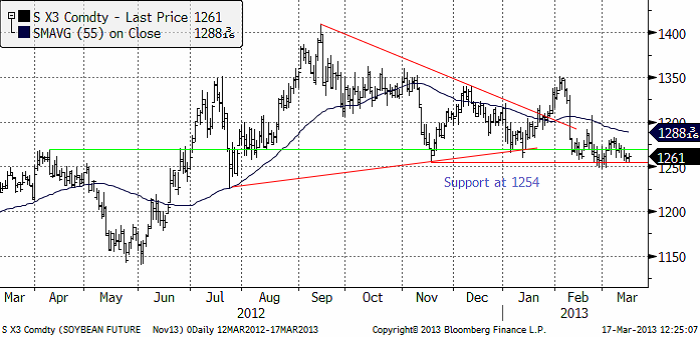 Sojabönorna (november 2013) har till skillnad från majs, vete och maltkorn, handlats ner i veckan som stödet som jag skrivit om tidigare, på 1254 cent, har hållit. Novemberterminen stängde i fredags på 1261.