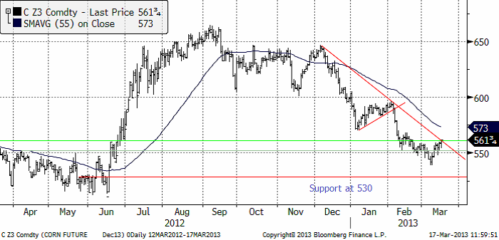 Majspriset (december 2013) fortsatte att stiga i veckan som gick. Priset gick upp till 561 cent – en nivå som dels ligger an mot den övre trendkanalen och dels är en nivå där uppgångar slutat tidigare. Marknaden står alltså nu under helgen och väger. Om priset håller sig på den här nivån får vi en någorlunda god bekräftelse på att prisfallet från december är över.
