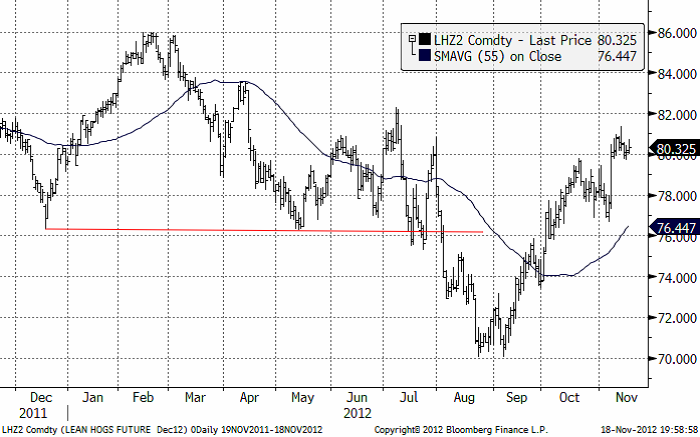 Grispriset som fann stöd på 70 cent har nu stigit upp till tidigare toppnivåer från i somras. De som legat köpta lean hogs bör nog ta hem vinster på den här nivån och avvakta vad som händer härnäst. 82 cent är en övre gräns, en nivå där priset i juli månad vände ner.