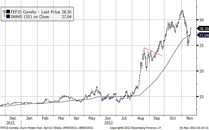 Vi tror att priset kommer att stiga i mars-kontraktet, snarare än falla. Till stöd för detta tar vi novmeberkontraktet 2013, som vi ser i kursdiagrammet nedan. Där finns ingen tydlig motståndsnivå på uppsidan, däremot ett starkt stöd som ligger på 235 euro. Vi ser att rekylen från 250 euro har hejdats av stödet. Efter sedvanlig ”sidledes” rörelse för att ta kraften av rekylen, tror vi det är sannolikt att priset gör ett nytt försök uppåt.
