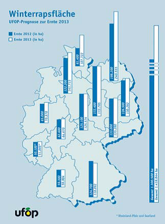 Baserat på en nyligen genomförd undersökning bland 5075 tyska lantbrukare som UFOP har gjort uppskattas arealen för höstraps 2013 att uppgå till 1.42 miljoner hektar, ett något lägre estimat än Oil Worlds 1.45 miljoner hektar. Attraktiva priser och gynnsamma väderförhållanden förväntas öka sådd av areal med 9.1%, vilket är en betydande ökning jämfört med den skördade arealen under 2012, särskilt i norr där lantbrukarna har utnyttjat de goda förhållandena vid sådd under augusti och september.