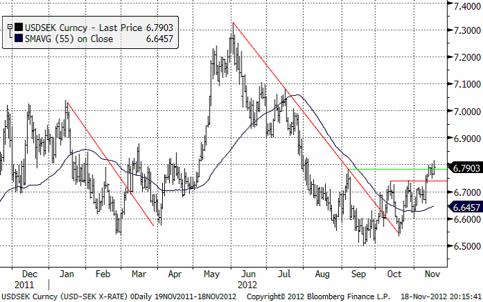 USDSEK som vid förra veckobrevets publicering just brutit en viktig motståndsnivå, steg raskt och bröt nästa motståndsnivå. Därmed har USDSEK fritt upp till 6.90. Vi tror med andra ord på en starkare dollar, liksom i förra veckobrevet.