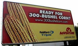 Som vi ser är trenden stadigt uppåtriktad och Monsanto, t ex förutspår att det kommer att vara normalt med 300 bushels per acre år 2030. Längs vägarna i ”corn belt” kan man se skyltar som den reklamskylt vi ser nedanför: