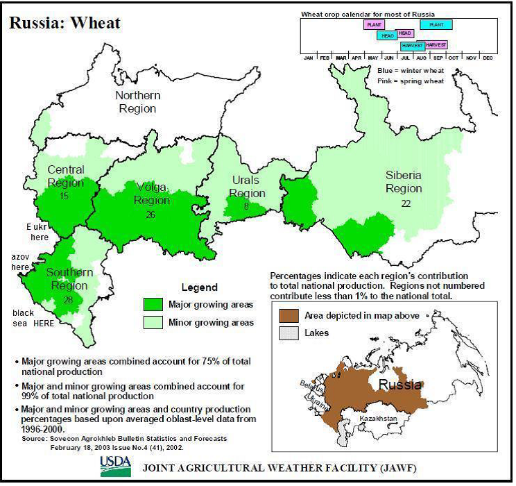 I Ryssland har den södra Krasnodar-regionen, en av få som nu är klara, skördat ca 5 mt spannmål, ungefär en tredjedel av förra årets skörd. På vissa ställen i västra Sibirien och Ural har temperaturen inte gått under 30 grader på över en månad, vilket också har lett till skogsbränder. Även om den ryska torkan är långt ifrån lika allvarlig som den i USA, har den extrema värmen fått landets jordbruksministerium att förra månaden sänka sin prognos för produktionen av spannmål till 80 mt, en minskning med 15 procent från förra året. I måndags sänkte Federal Metereorological and Environmental Monitoring Service sin prognos till 77 mt från 80 mt, något som förväntas följas av jordbruksministeriet. Ryssland behöver ca 72 mt spannmål för inhemska behov, och exporterar i allmänhet det som blir över. Oron över att Ryssland ska inför exportförbud eller exportrestriktioner kvarstår, men skulle kunna vara något som blir svårare för landet att införa i och med Rysslands inträde i WTO där reglerna för den globala handeln begränsar sådana genomföranden.