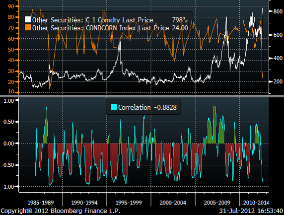 Crop conditions rapporterades i måndags kväll som 24% av majsskörden i good eller excellent condition. Detta fick priserna naturligtvis att stiga ännu mer. Studerar vi förhållandet mellan crop condition och majspris ser vi att korrelationen över tiden mellan förändringar i crop condition och majspris är kraftigt negativ, som den borde vara. Vi ser detta nedan, med de faktiska noteringarna i den övre delen och korrelationen dem emellan i den nedre.