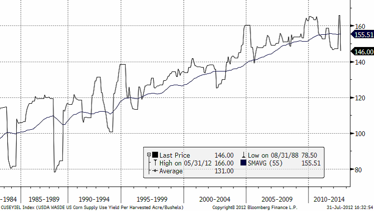 Nedan ser vi den av USDA enligt WASDE-rapporterna väntade avkastningen i bushels per acre i USA.