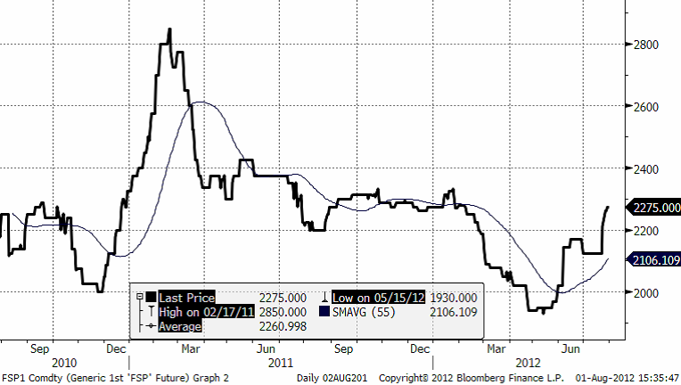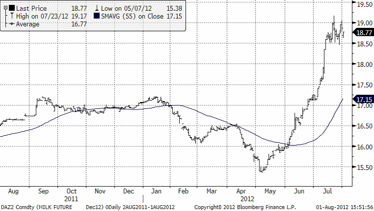 Mjölkpriset drivs naturligtvis upp pga av torkan i USA och Ryssland, som även drabbar höproduktionen. Priset på skimmed milk powder på tyska börsen har fått från 1950 i maj till 2275 euro per ton idag, som vi ser i diagrammet för priset på spotkontraktet på tyska Eurex nedan.