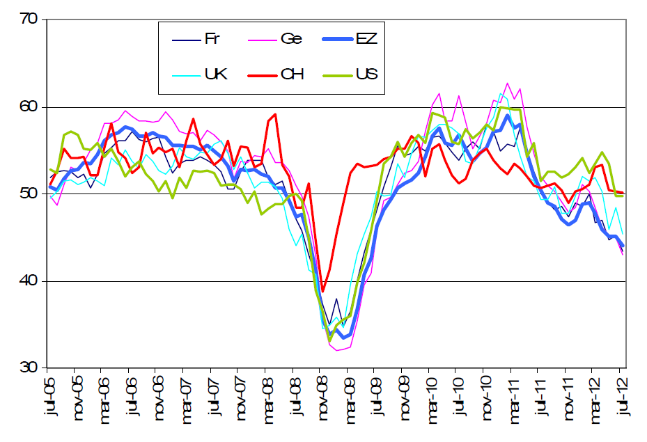 Inköpschefsindex, PMI, för de stora ekonomierna har sjunkit stadigt det senaste året. Tysklands PMI för tillverkningsindustrin ligger nu under Frankrikes, på 43 mot 43.4. Eurozonen ligger på 44. Storbritannien har bromsat in fort de senaste tre månaderna och har sjunkit från 50.2 i april till 45.4 i juli. USA har halkat under 50. Endast Kina ligger över 50. Gårdagens kinesiska PMI kom in på 50.1, vilket är en tiondel lägre än i juni (50.2). PMI anses vara en ”ledande indikator” för ekonomins utveckling.