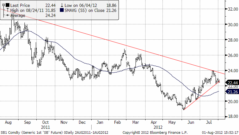 Priset på socker ligger fortfarande och balanserar: antingen bryts stödet och då för vi troligtvis en större prisnedgång mot 19 cent. – Eller så bryts motståndet som nu ligger på ca 23 cent, och då får vi antagligen en prisuppgång till 26 cent i första hand, kanske ännu mer.