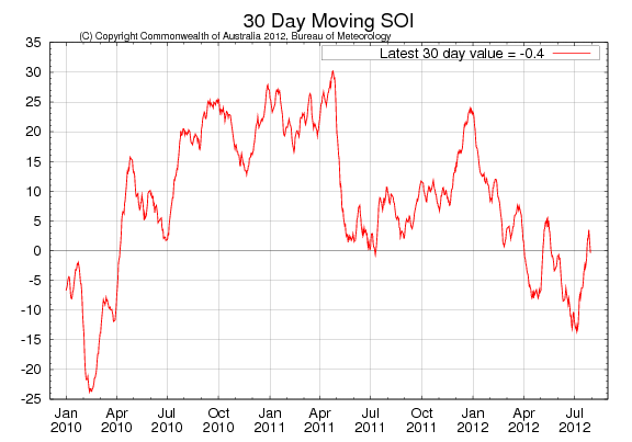 Southern Oscillation Index har tagit sig upp till neutrala förhållanden igen, men det anses vara temporärt, eftersom de flesta prognosmodeller pekar på att ENSO ska vara nära El Niño-förhållanden, dvs med SOI närmare eller lägre än -8.