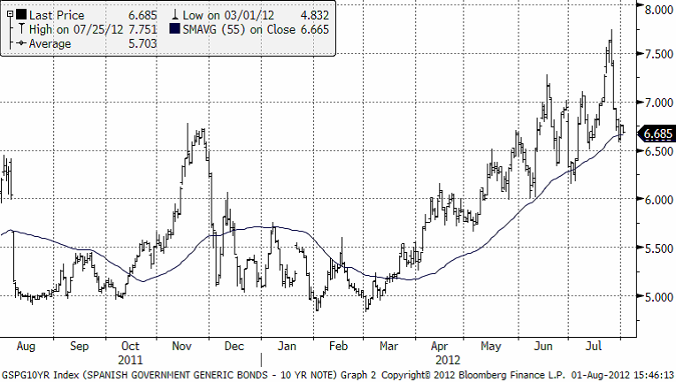 Vad som sker i EU är att det finns en social acceptans att banker tas över av staten därför att man inte vill uppleva obehaget av att bankerna går under var och en för sig, Detta gör att det är rimligt att anta att staternas i fråga egentliga skulder är deras egen statsskuld + bankernas skulder. När man studerar den typen av skuldberg i förhållande till de här ländernas skatteintäkter, får man en skrämmande bild. Än så länge försöker man skjuta upp det oundvikliga. ECB:s satsning på att få ner räntorna i Spanien är det senaste och främsta exemplet på detta. Vi ser nedan hur räntorna har på deras tioårs statsobligation har fallit från 7.75 till 6.68. Förmodligen får vi se räntemarknaden ta ett nytt kliv uppåt inom kort. Skuldberg av den här storleken blir man av med genom att inte betala (skuldnedskrivning / konkurs) eller genom att betala med nytryckta pengar (inflation).