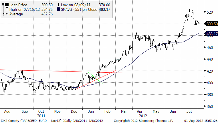 I Storbritannien däremot förväntas en minskning med 100 000 ton från förra årets rekordskörd på 2.7 mt, trots ökad sådd, men det är fortfarande oklart hur de senaste tidens kraftiga regn kommer att påverka grödorna. Med tanke på att rapsen noteras i euro, som är svag, kan man tänka sig högre priser (i euro) framöver.