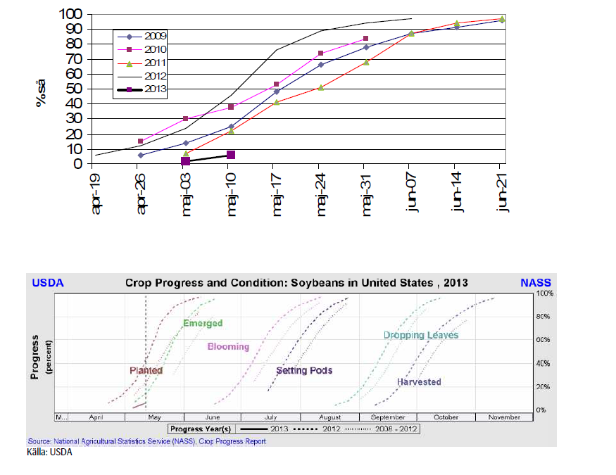 Måndagens Crop Progess visar att sådden av sojabönor nu är avklarad till 6%, vilket kan jämföras med 43% vid den här tiden förra året och det femåriga genomsnittet på 24%.