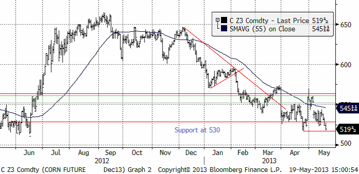 Majspriset (december 2013) är nu nere och testar årets bottennotering från april. Det ser ut att kunna bli ett brott nedåt. Det beror sannolikt på ”planting progress”-rapporten på måndag kväll klockan 22:00, eller på spekulationer om att sådden har varit rekordsnabb i det gynnsamma vädret.