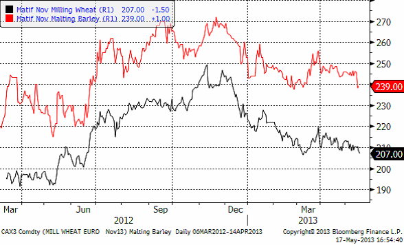 Maltkorn föll relativt kraftigt i veckan vilket gjorde att prisskillnaden mellan maltkorn och kvarnvete fick en ”återställare”. Relationen mellan maltkorn och vete har historiskt varit väldigt stabil.