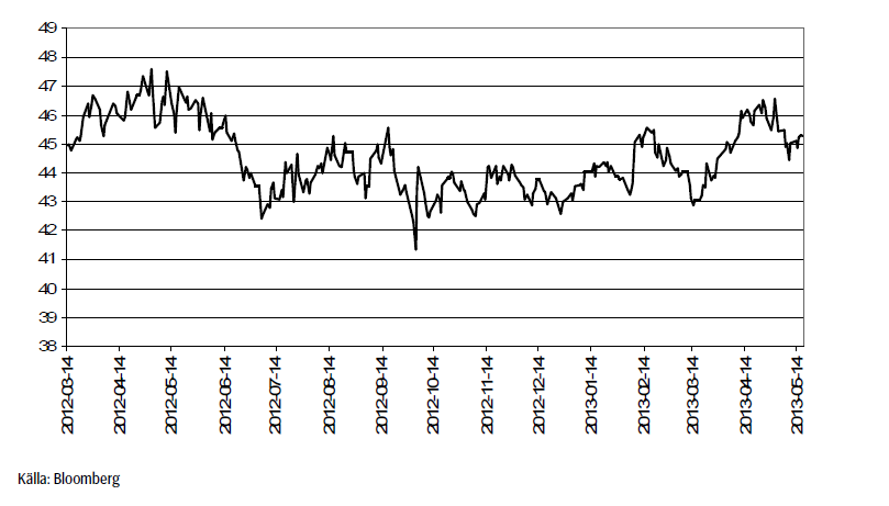Nedanför ser vi kvoten mellan rapsterminspriset (nov) mot sojabönspriset (nov). Vi ser att raps fram till maj månads början handlades allt dyrare i förhållande till sojabönor, men att detta, som vi påpekat börjat normaliseras genom ett större prisfall på raps än på sojabönor. Ännu finns det extra fallhöjd i rapspriset, eftersom rapsen fortfarande är dyr i ett historiskt perspektiv, i förhållande till sojabönor.