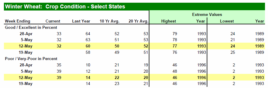 Måndagens Crop Progress rapport från USDA visar att tillståndet för det amerikanska höstvetet i stort sett var oförändrat i de 18 stater som rapporterar. Vete i merparten av de HRW producerande staterna klassas fortfarande som ”poor/very poor”, medan vete i de SRW producerande staterna mestadels klassas som ”good/excellent”. För de 18 staterna sammantaget så klassas 32% som ”good/excellent”, oförändrat från förra veckan men väl under förra årets 60% vid samma tid. Höstvete klassat som ”poor/very poor” uppgår till 39%, också oförändrat från förra veckan men väl över förra årets 14% vid samma tid.