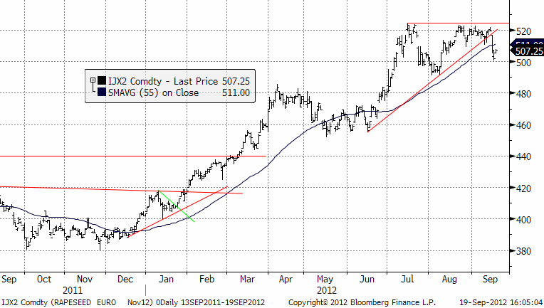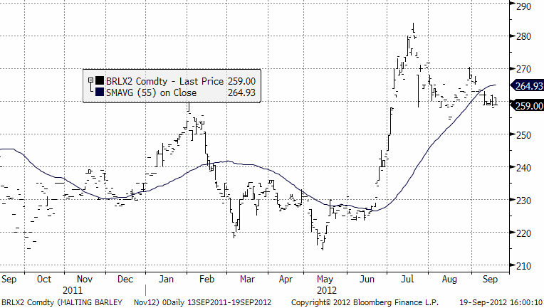 Novemberkontraktet på maltkorn har brutit 55-dagars glidande medelvärde och det är en varningssignal. 260 euro fungerar just nu som stöd, men med tanke på svagheten i majs och vete är det inte sannolikt att maltkorn skulle kunna försvara marken om de andra två marknaderna börjar falla.