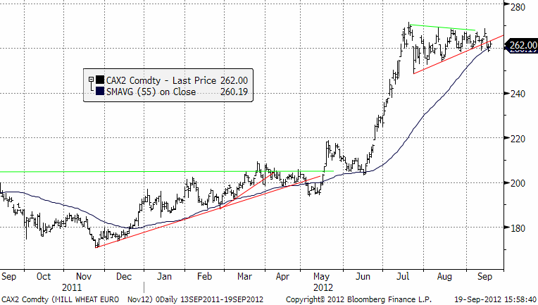 Nedan ser vi Chicagovetet med leverans i december. Vi gillar inte att 55-dagars glidande medelvärde är brutet och att 865.5 bröts vid kursfallet tidigare i veckan. Flaggan i sin helhet är inte bruten, men den tekniska bilden är mindre positiv än förra veckan.