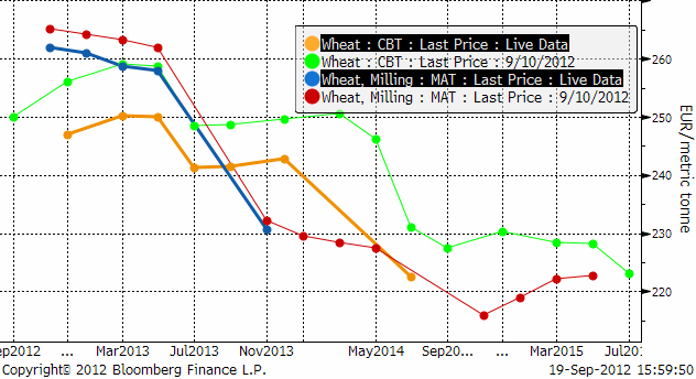 I diagrammet nedan ser vi terminspriserna framåt i tiden för Chicago och Matif och förändringen från 7 dagar sedan.
