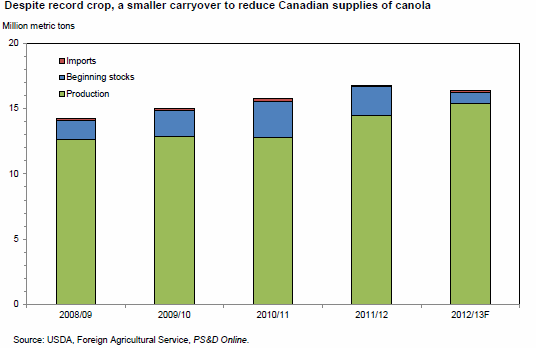 Prognosen för den globala produktionen av raps 2012/13 justeras ned med 563 000 ton denna månad av USDA till 61.3 mt då en lägre produktion i Kanada endast delvis kompenseras av en ökad skörd i EU. Växtförhållandena har huvudsakligen varit gynnsamma, men vissa områden har inte klarat sig lika bra. I Saskatchewan har lantbrukare sått mindre raps än man tidigare trott som en följd av alltför mycket nederbörd under våren. Detta gör att den estimerade arealen justeras ned 0.1 miljoner hektar, vilket fortfarande är en rekordnivå. Med en lägre areal och minskad avkastning justeras den kanadensiska produktionen av raps ned med 900 000 ton till 15.4 mt.