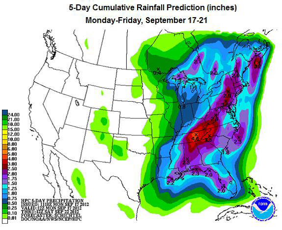Väderprognoserna visar på kraftiga regn i sydöstra USA de närmaste dagarna, medan betydligt mindre nederbörd förutspås i de nord-centrala delarna samt i de höstvete producerande staterna Colorado, Nebraska och South Dakota: