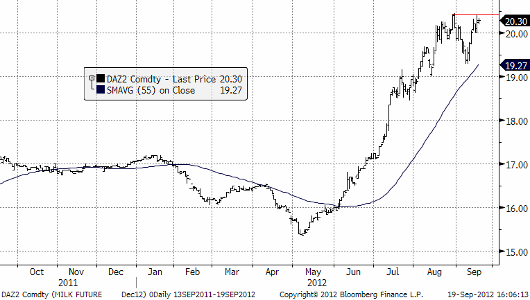 På den amerikanska börsen CME i Chicago testar priset på Klass 3 mjölk nu högstanoteringen. Ett brott uppåt öppnar för ytterligare uppgång, men den relativt kraftiga rekylen i september ger en varningssignal om att uppåttrenden är ifrågasatt av somliga på marknaden.