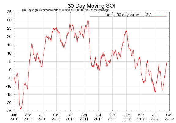 SOI har fortsatt att stiga och ligger nu på +3.3 (+1.2). Det kan tolkas som att tendensen till El Niño har avtagit. Ensembleprognosen pekade vid senaste körningen vid månadsskiftet på en ENSO på gränsen till El Niño. Då borde vi egentligen se SOI på lite lägre nivåer och att vi inte gör det får tolkas som att ENSO har rört sig från El Niño. Den senaste ensembleprognosen visade också lite mindre tendens till El Niño än prognosen från månaden före. Den aktuella SOI-noteringen är alltså en fortsättning på en trend till mindre El Niño.
