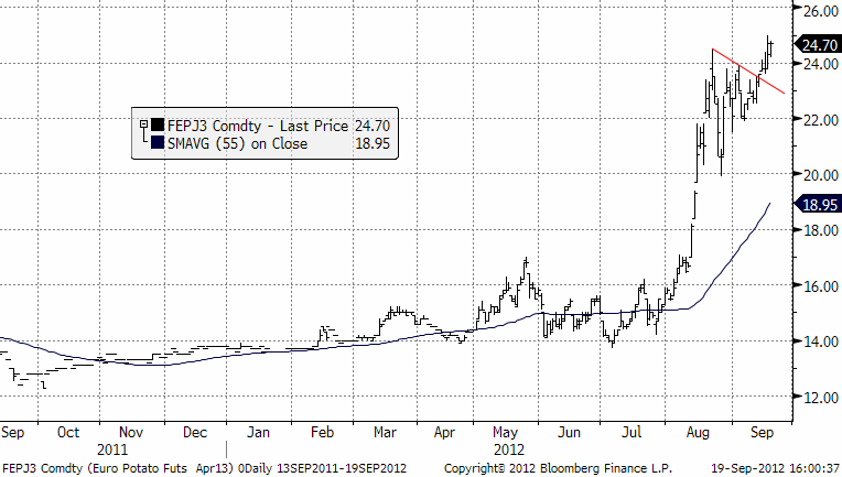 Potatispriset handlades över 24 euro per dt, vilket utlöste den köpsignal vi talade om förra veckan. Potatis noterar nu kontraktshögsta. Detta brukar kunna följas av nya toppnoteringar.
