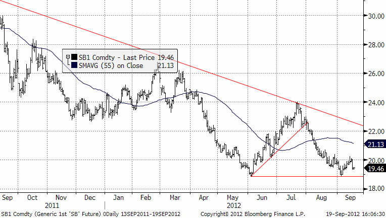 Priset på socker, föll liksom många jordbruksprodukter kraftigt i måndags. 20 cent blev därmed ett övre tak för kursrörelserna just nu. Skulle priset gå över 20 cent, får vi därmed en köpsignal, men just nu är vi neutrala till socker.