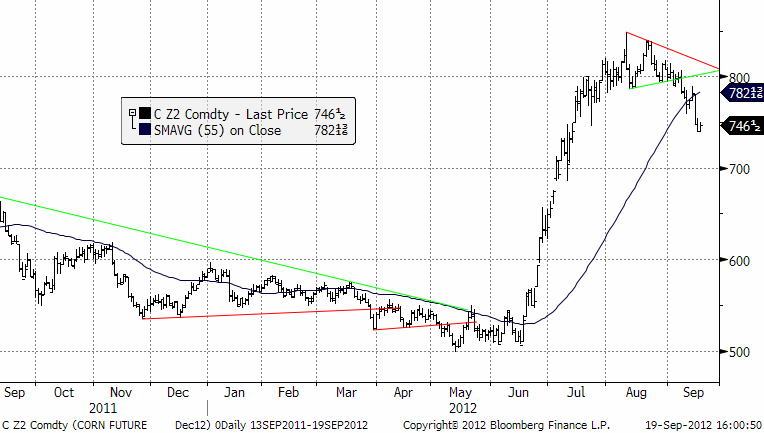 Vi började varna för prisfall i majs för tre veckor sedan, vilket vi har upprepat med ökande övertygelse för varje vecka. Marknadens beteende passar inte in i bilden av en stigande marknad, utan snarare en marknad som är i en ”bear market”. 55-dagars glidande medelvärde är brutet, vilket är ytterligare en signal om svaghet. Vi tycker man ska vara kort majs. Ska man skydda den korta positionen bör man lägga in en ”buy stop” på 786 cent, vad gäller decemberkontraktet.