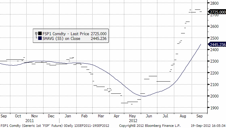 Tekniskt har oddsen för ett brott uppåt försämrats avsevärt. Marknadens oförmåga att hålla kvar priset ovanför triangelformationen (bara en kortvarig rusning uppåt, som snabbt såldes ner igen) och den senaste sonderingen under golvet på triangeln, är en tydlig varning om en snar (och impulsiv) likvidering. Om inte toppnoteringen på 268.75 tas ut inom de närmaste dagarna, tror vi att det är klokt att gå ur långa positioner, och i synnerhet om 55-dagars glidande medelvärde bryts ordentligt.