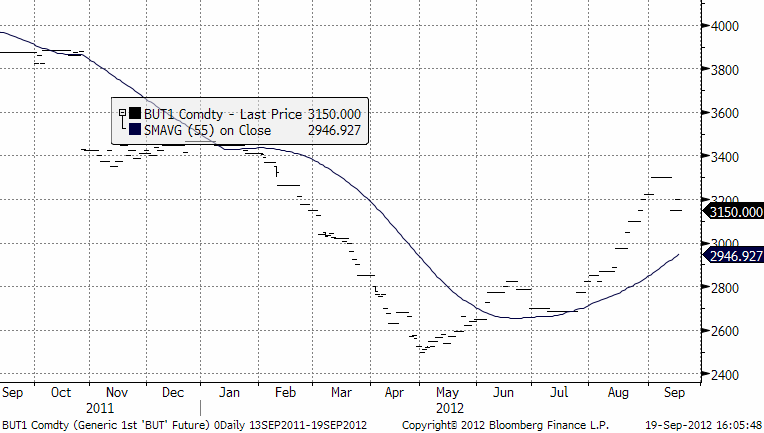 Nedan ser vi priset på smör, som backat ännu tydligare än som är fallet med SMP.
