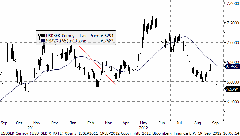 EURSEK har nått så långt upp som den borde enligt teknisk analys. Tekniskt pekar det nedåt nu och vi har säljrekommendation på euro mot kronor. Vi är negativa både på en veckas, såväl som tre månaders sikt.