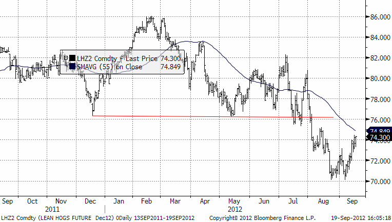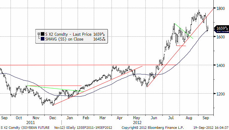 Novemberkontraktet som likviderades kraftigt i måndags, bröt stödlinjen, vilket indikerar att den uppåtgående trenden är bruten. Priset fick stöd på 55-dagars glidande medelvärde. Än så länge har vi inte någon säljsignal från den tekniska analysen. Vid 1600 finns ett stöd, eftersom mycket handel skedde på den här nivån mellan juli och augusti. Marknaden skulle kunna få stöd där, och sedan stiga därifrån. För att verkligen få den uppgången skulle vi vilja se kraften att ta priset upp till 1693.5 cent / bu.