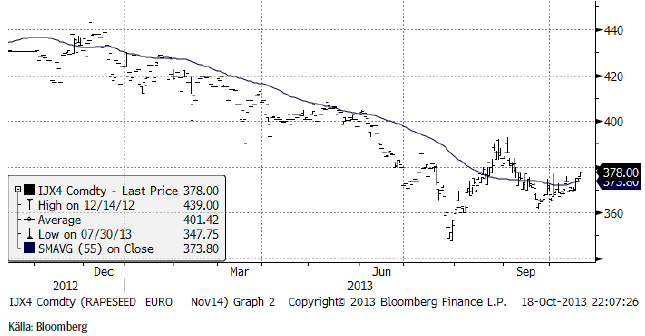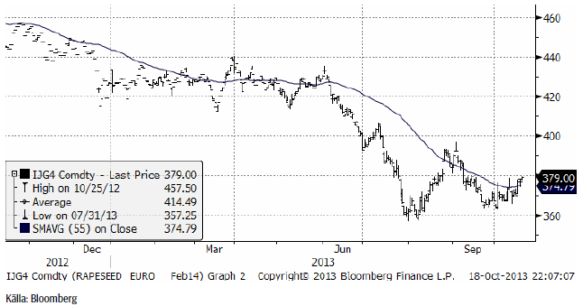 Rapspriset (februari 2014) gick inte under det tekniska stödet på 360 euro i början av oktober och har sedan dess stigit på ett sätt som inte riktigt kan förväntas av en marknad som ska vara i fallande trend. Priset ligger nu strax under 380 euro. Om priset går över 380 euro förändras bilden ytterligare. Det kan vara en trendvändning uppåt på gång. Det återstår att se.