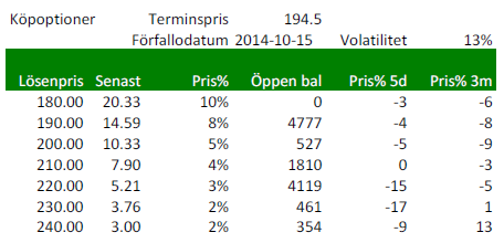 Nedan ser vi priserna på köpoptioner på Matif på November-2014 (Matif vete). Notera att volatiliteten 13% är ganska låg. Volatiliteten brukar vara låg när priserna är låga. Den är faktiskt något lägre än förra veckan, vilket inneburit att priset på såväl köpoptioner som säljoptioner gått ner i pris.