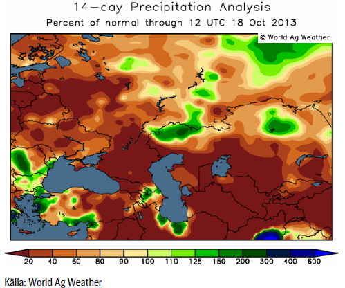 Torkan i Kina är bra för skörden av majs och sojabönor, men hindrar sådden av höstvetet. Detta väntas leda till att 10% mindre areal blir sådd i år än man tidigare hoppats. CNGOIC estimerar Kinas vete produktion till 122.17 mt 2012/13, jämfört med USDA’s estimat på 121 mt.