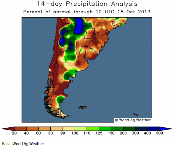 Sådden av sommarmajs är i full gång i Brasilien sedan slutet av september. Längst har lantbrukare i södra delen av landet kommit, där majs förlorar stort mot sojabönor. CONAB rapporterar från Brasilien att arealen av majs kan bli den minsta sedan 1970-talet, när CONAB började föra statistik. I Paraná var 56% av den väntade arealen sådd i mitten av oktober. I Rio Grande do Sul rapporteras 52% vara sått. Conab estimerar att arealen kan bli 6.36 – 6.57 mha, som är 3.7% – 6.8% lägre än förra året. Hektarskörden estimeras bli 5,104 Kg / ha. Om man tar hänsyn till skörd nummer två, säger CONAB att den totala arealen kan bli 15.36 – 15.57 mha, vilket kan leda till en skörd på 78.43 – 79.63 mt. Det ska jämföras med skörden förra året 2012/13 på 81 mt. Utgående lager, som i Brasilien avser innan skörd i januari, väntas bli rekordhöga 14.6 mt.