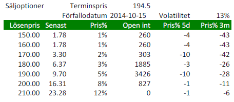 Nedanstående är priser på säljoptioner. Om du köpt optionen med lösenpris 200 euro (för 16.31) och terminen i oktober nästa år står i 180 euro, betalar banken ut 20 euro. Om terminspriset är över 200 euro betalar banken inte ut någonting alls och optionen förfaller värdelös.