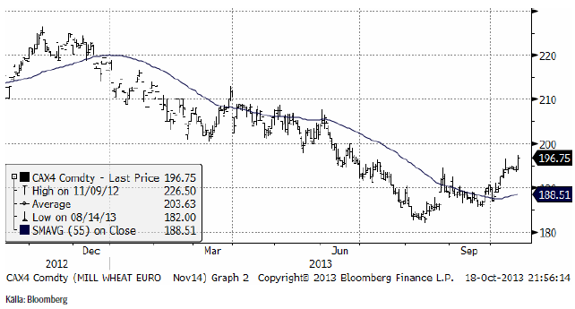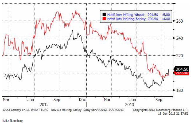 Terminspriset (november) ligger nu 4.5 euro under vetepriset, för november 2013, som snart förfaller.