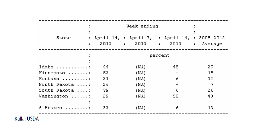 Crop Progress-rapporten visar också att sådden av vårvete i USA har fått en långsam start. 6% är i marken, vilket är att jämföra med det femåriga genomsnittet på 13% och 33% förra året, som en följd av snöfall i de norra staterna som producerar vårvete. Snön, som inte bara försenar sådden, leder också till en viss oro för översvämningar vid en snabb snösmältning framöver.