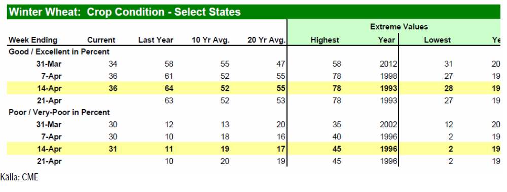 USDA bekräftar att frost har skadat somliga höstgrödor som har kommit ur vintervilan, och som då är mer utsatta för kyla. Bl.a i Kansas, oroar sig lantbrukarna över de låga temperaturernas påverkan på grödorna, men det är fortfarande för tidigt att avgöra skadornas omfattning. I måndagens Crop Progress rapport från USDA så klassas dock fortfarande 36% av det amerikanska höstvetet som ”good/excellent” vilket är oförändrat från förra veckan, men givetvis mycket lägre än förra årets 64% vid samma tid, men samtidigt bättre än vad marknaden hade förväntat sig. Andelen grödor klassade som ”poor/very poor” har dock ökat med 1% till 31%.