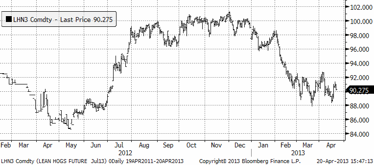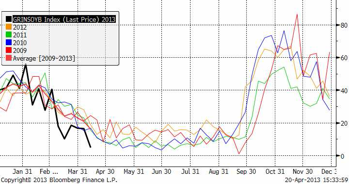 Sojabönorna (november 2013) har tagit nästa trappsteg nedåt och studsade på 1200 cent, med 1225 som övre motstånd. Chansen är stor att 1200 bryts i veckan som kommer. Det rapporterades bland annat i veckan att efterfrågan på griskött i USA utvecklas svagt och fågelinfluensan i Kina kan påverka importbehovet av sojabönor i Kina något sämre, allt annat lika. Det kalla och ogynnsamma vädret för sådden av majs i USA, där endast 2% var i backen i förra måndagens statistik, gör att mer areal kan flyttas över till soja istället. Soja sås senare än majs. På samma sätt som det amerikanska vädret ger stöd för majspriset, verkar det alltså negativt på sojapriset.