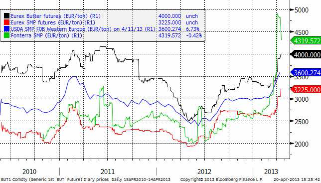 Priserna på smör och skummjölkspulver har fortsatt att stiga på Eurex. Sedan förra veckan har det implicita priset på mjölk, som man får genom att ta rätt andelar smör och SMP, stigit med 10% för leverans i maj och med 9% för leverans i juni. För leverans längre fram i tiden har det varit betydligt mindre prisrörelser.