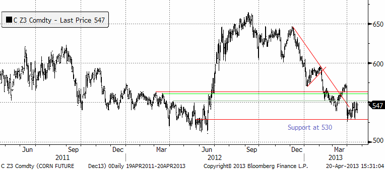 Prisfallet har stannat av därför att sådden går långsamt. Det är vädret som styr. Om vädret förbättras och takten i sådden ökar, kan ett test av 530 cent bli aktuellt i veckan. Minns den stora arealen från prospective plantings-rapporten för ett par veckor sedan. Marknaden väntar bara på varmare och torrare väder i ”Corn belt” i USA för att sälja terminer.